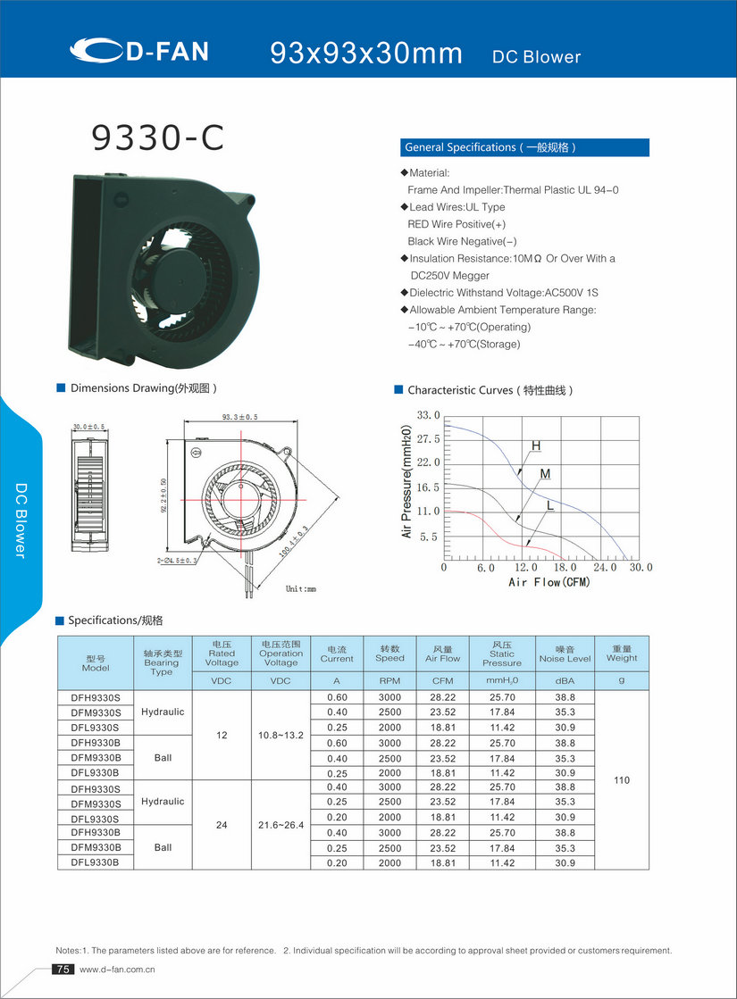 材料: 框架和叶轮:热塑UL 94-0 引线:UL型 红线正极(+) 黑线负极(-) 绝缘电阻:10MΩ或以上,带DC250V高阻表 介质耐压:AC500V 1S 允许环境温度范围: -10℃~+70℃(运行) -40℃~+70℃(储存)
